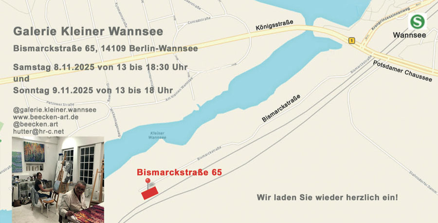 Samstag von 13.00 bis 18.30 Uhr und Sonntag von 13.00 bis 18.00 Uhr Galerie am kleinen Wannsee, Bismarckstraße 65, 14109 Berlin- Wannsee.